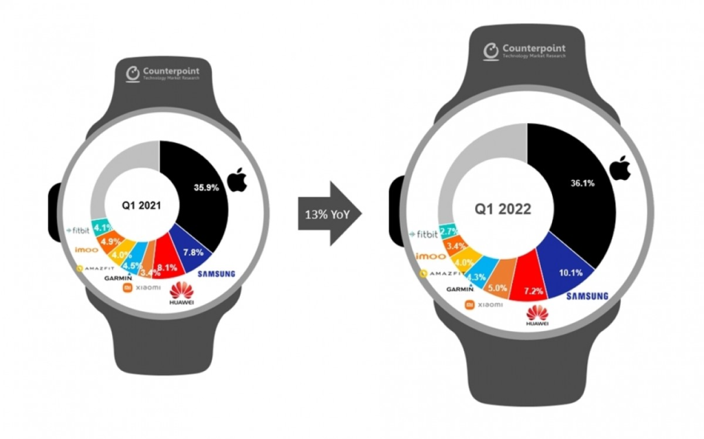 The smartwatch market between January and March 2022 saw a 13% increase in shipments, according to Counterpoint Research. The analysis of the wearable market across the globe revealed Apple, Samsung, and Xiaomi all recorded an increase on yearly basis, despite the quarterly 24% decline – the holiday quarter is obviously hard to match.