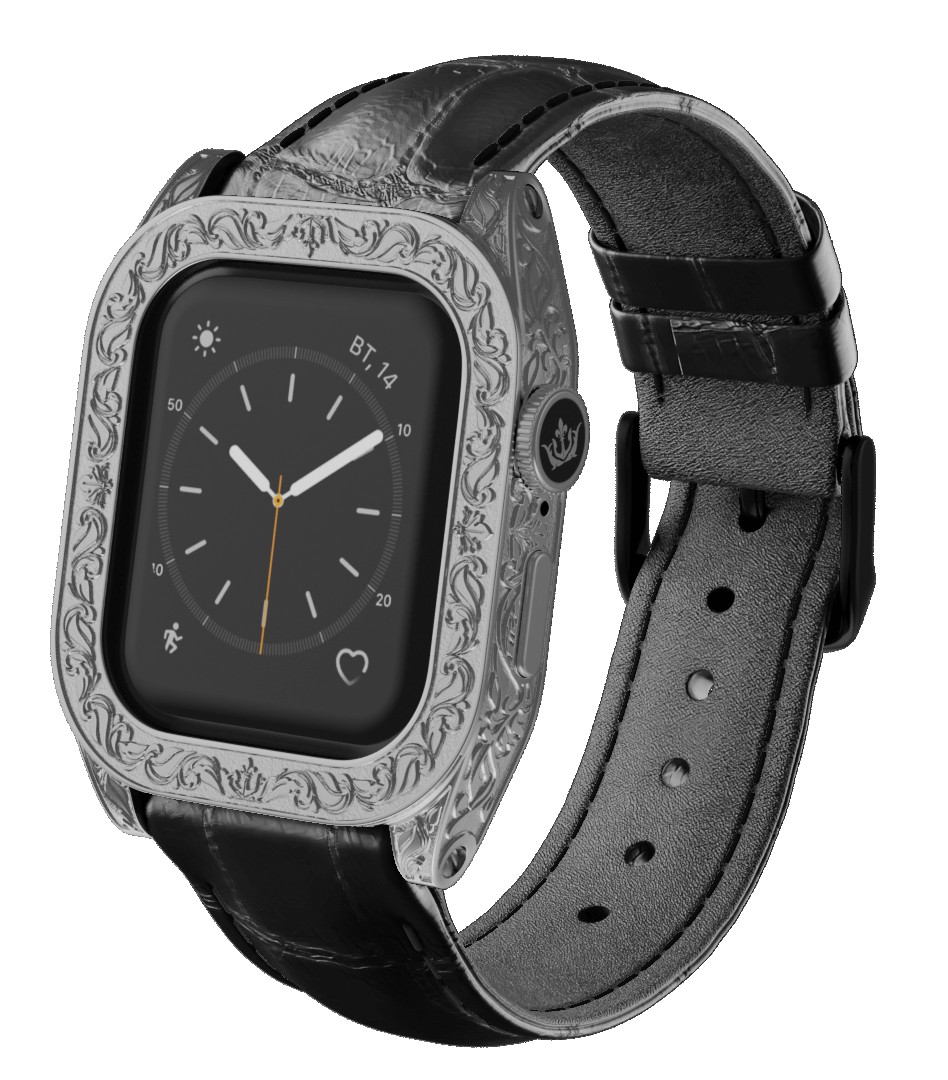 It released a series based on the Apple Watch 7, that roughly fall into two main versions. The first features embossed ornamentation inspired by the work of Gustave Young, a famous 19th century engraver of American firearms. This is the Moon series.